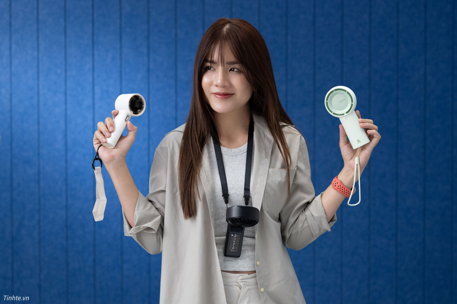 Kiểu thiết kế thẳng đứng thông thường khi đeo trước ngực thì nó sẽ dính vào người, nhưng thiết kế của con này gập ngang nên vừa đeo vừa bẻ quạt hướng lên mặt – mình gọi vui là “quạt rảnh tay”.