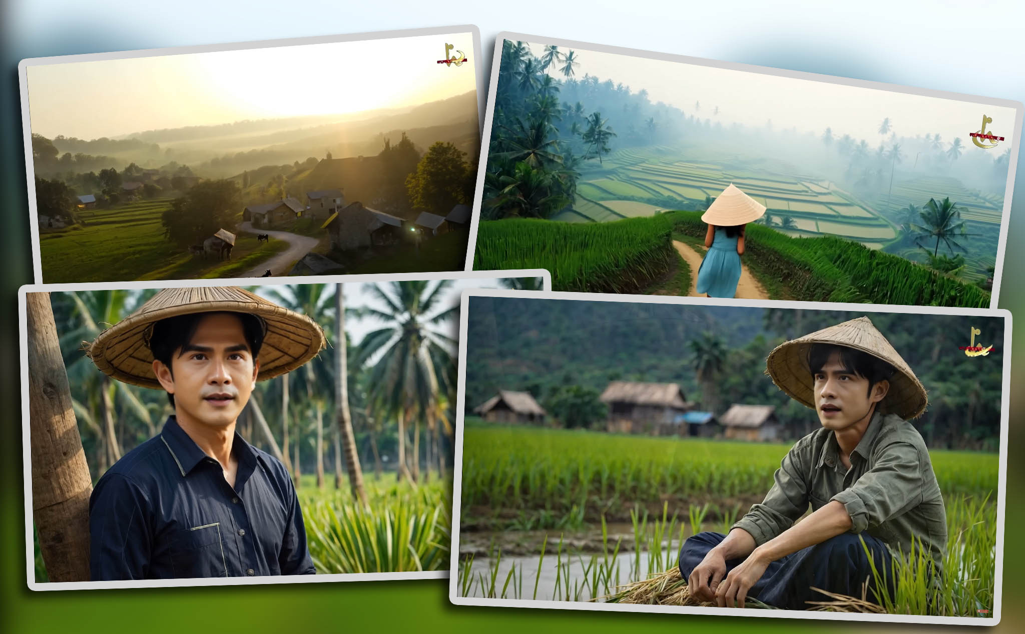 Có rất nhiều đoạn cắt cảnh trong MV của anh Bo được làm theo cách tương tự, chẳng hạn như đoạn dưới đây, có thể đã lấy hình chụp một cô gái đi trên con đường làng rồi ghép thêm chi tiết hình ảnh ở nền. Rồi sau đó ê kíp phát hiện ra là cần cái nón, thế là dùng inpainting để ghép thêm vào, hệ quả là cái nón vừa quá to vừa lệch.