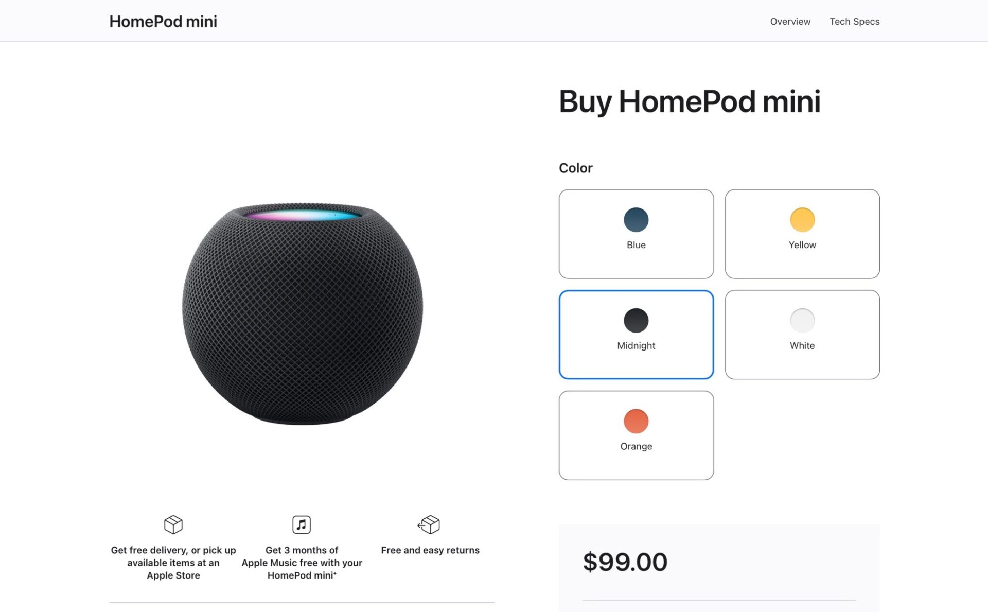 Anh em hiện có thể đặt hàng HomePod mini với màu Midnight (đen nửa đêm) mới. Màu này sẽ thay thế cho màu xám không gian trước đó và gia nhập bộ sưu tập gồm các màu trắng, xanh, vàng và cam. Mình đã có dịp sử dụng HomePod Mini thì mình có cảm nhận là màu mới này nó gần như không khác biệt quá nhiều, có lẽ cập nhật để đồng bộ màu sắc với HomePod 2 thôi.