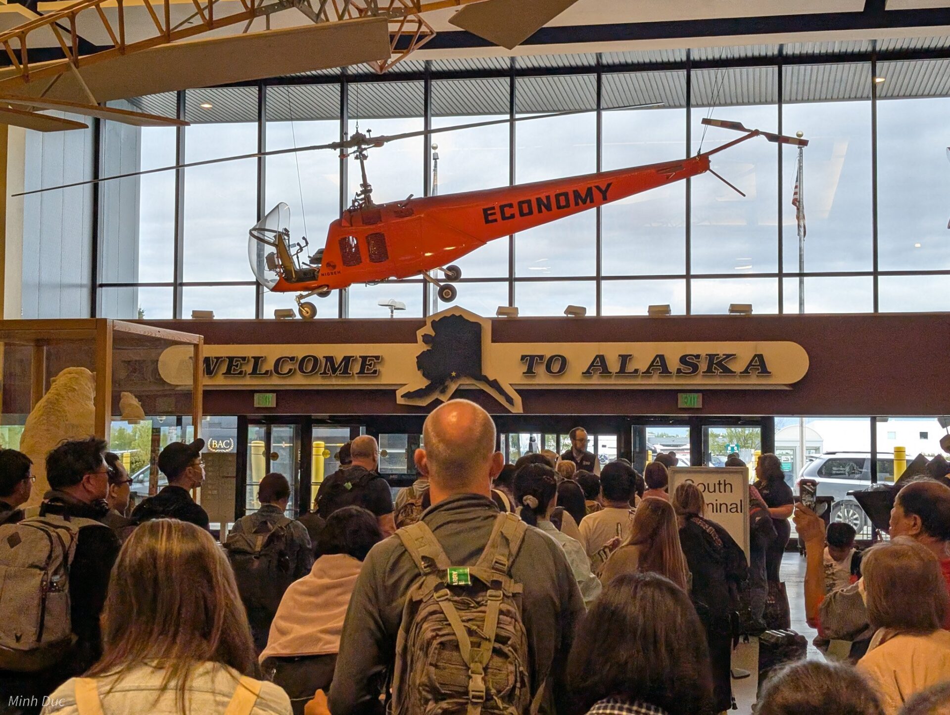 Rảnh thì làm gì? Máy tính sau khi dùng cạn pin, ipad sau khi cạn pin,… mình đi vòng vòng hết các cửa hàng ỏ sân bay. Ga quốc nội ở đây thì đông hơn ga chở hàng một trước một chút. Các cửa hàng bán đồ lưu niệm cũng có, vẫn là các món đặc trưng ở đây như móc gắn chìa khóa, đế ly, đồ khui,… Hầu hết đều là slogan “Alaska – American Last Frontier” (tiền đồn cuối cùng cửa nước Mỹ). À, tới đây thì mình mới biết là quà lưu niệm ở đây nổi tiếng là các hộp cá hồi xông khói, tìm hiểu kỹ mới biết là vùng này siêu nổi tiếng cá hồi luôn.