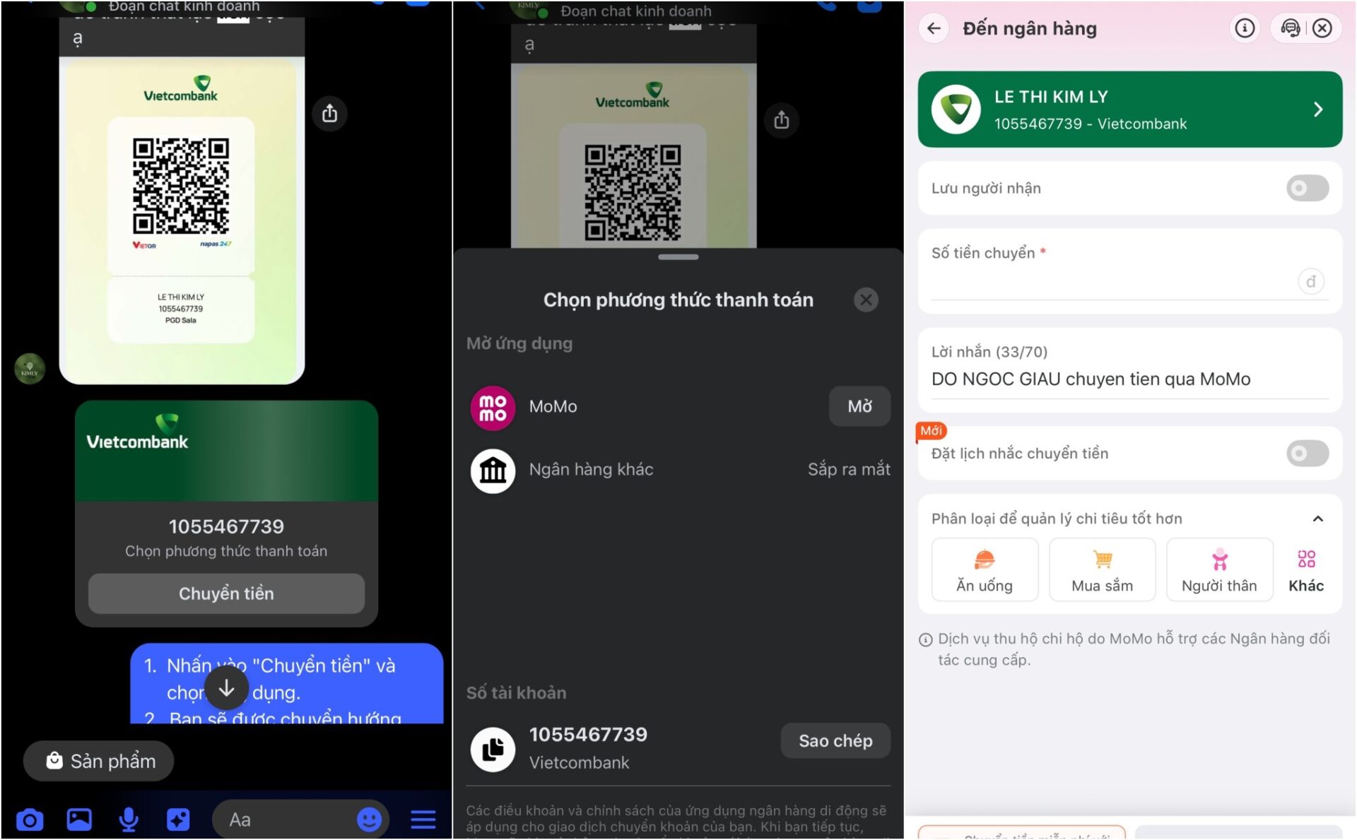 Ngân hàng khác hiện thông báo sắp ra mắt. Tất nhiên nếu ngân hàng hay MoMo đang ở trạng thái đăng xuất thì phải đăng nhập lại rồi mới xuất hiện giao diện chuyển tiền. Và nếu ngân hàng chưa được hỗ trợ thì ít ra nó cũng sẽ tự lọc ra thông tin tài khoản trong cái tin nhắn dài dòng của shop để mình sao chép cho dễ và dán vào ứng dụng ngân hàng.