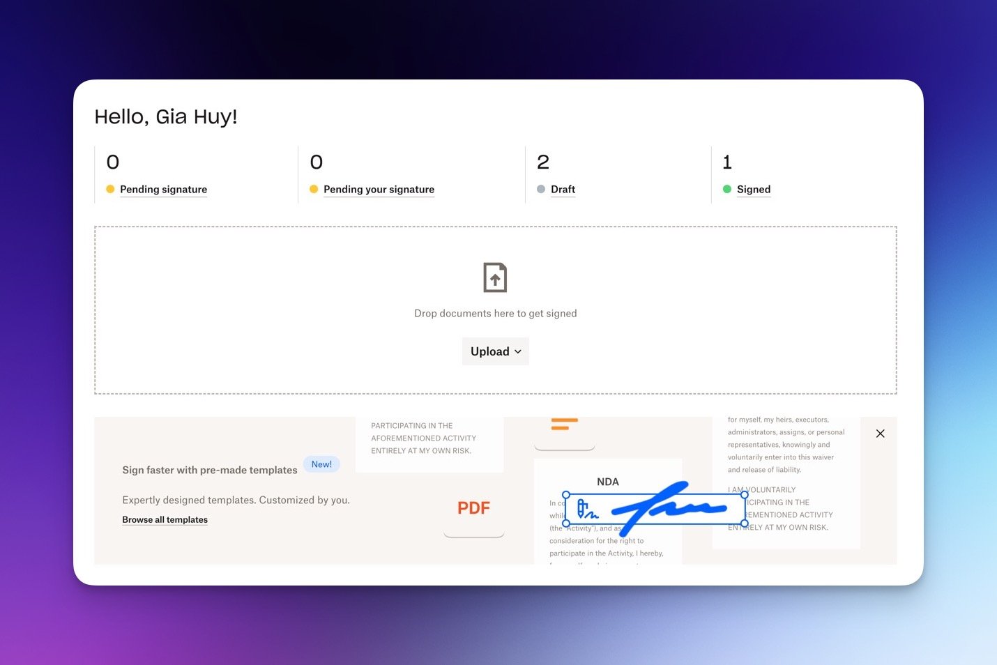 • Dropbox Sign cho phép chuyển đổi các tài liệu thường xuyên sử dụng thành các mẫu có thể tái sử dụng. Các mẫu này giữ lại định dạng và trường chữ ký đã thiết lập, cho phép nhanh chóng điền chi tiết cụ thể mà không cần thiết lập lại từ đầu.