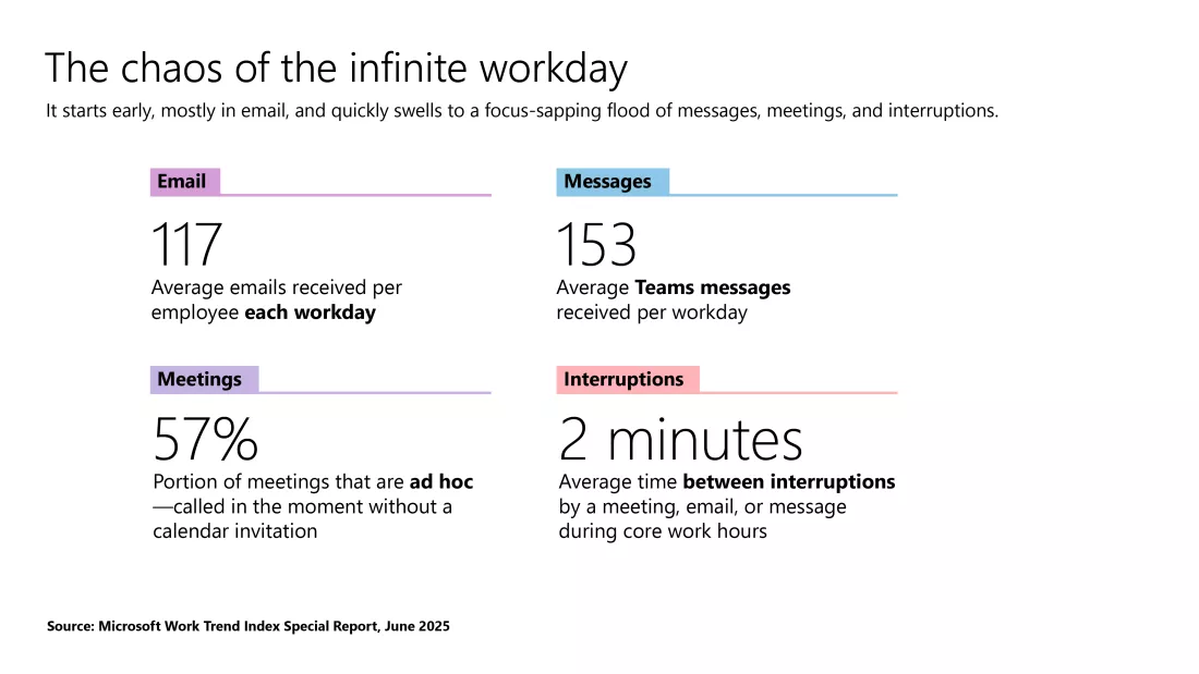 Dữ liệu cho thấy một người lao động trung bình nhận được 117 email và 153 tin nhắn Teams mỗi ngày. Điều đó có nghĩa là nhân viên sử dụng Microsoft 365 bị gián đoạn cứ sau 2 phút bởi một cuộc họp, email hoặc thông báo.