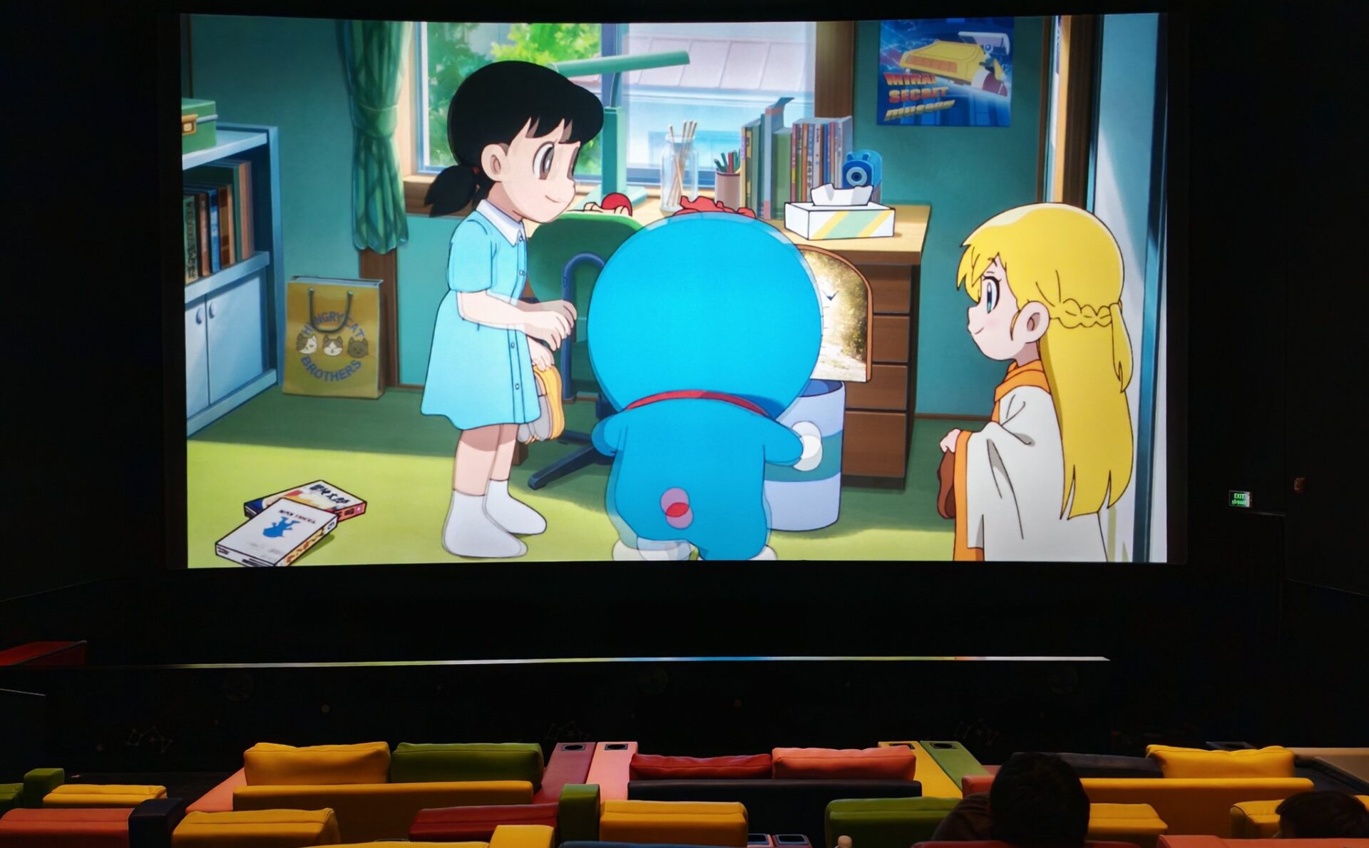 Ta đa…. Nhìn cái rạp trên mạng đã mê. Tới nơi mê hơn. Xanh xanh đỏ đỏ cho em nhỏ nó ham. Ghế lùn thấp cho trẻ, màu sắc và rạp chỉ hạ ánh sáng chứ không tắt đèn tối thui.