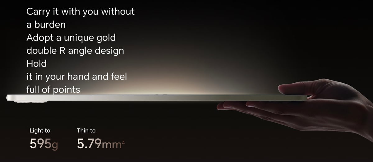 Thiết kế mỏng nhẹ với độ mỏng 5.79 mm, khối lượng 595 g.