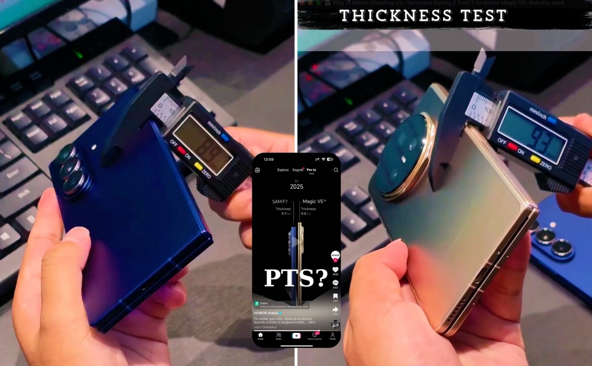 Tuy nhiên, trong hình ảnh quảng cáo, Honor được cho là đã điều chỉnh độ dày chiếc Magic V5 xuống chỉ còn khoảng 7.1 mm thông qua phần mềm chỉnh sửa. Phân tích hình ảnh cho thấy trong khi Z Fold 7 giữ nguyên độ dày 8.9 mm, thì Magic V5 đã được gọt mỏng đi đáng kể, mỏng hơn cả con số 8.8 mà Honor chú thích luôn, này chắc anh thiết kế hơi lố tay xíu.