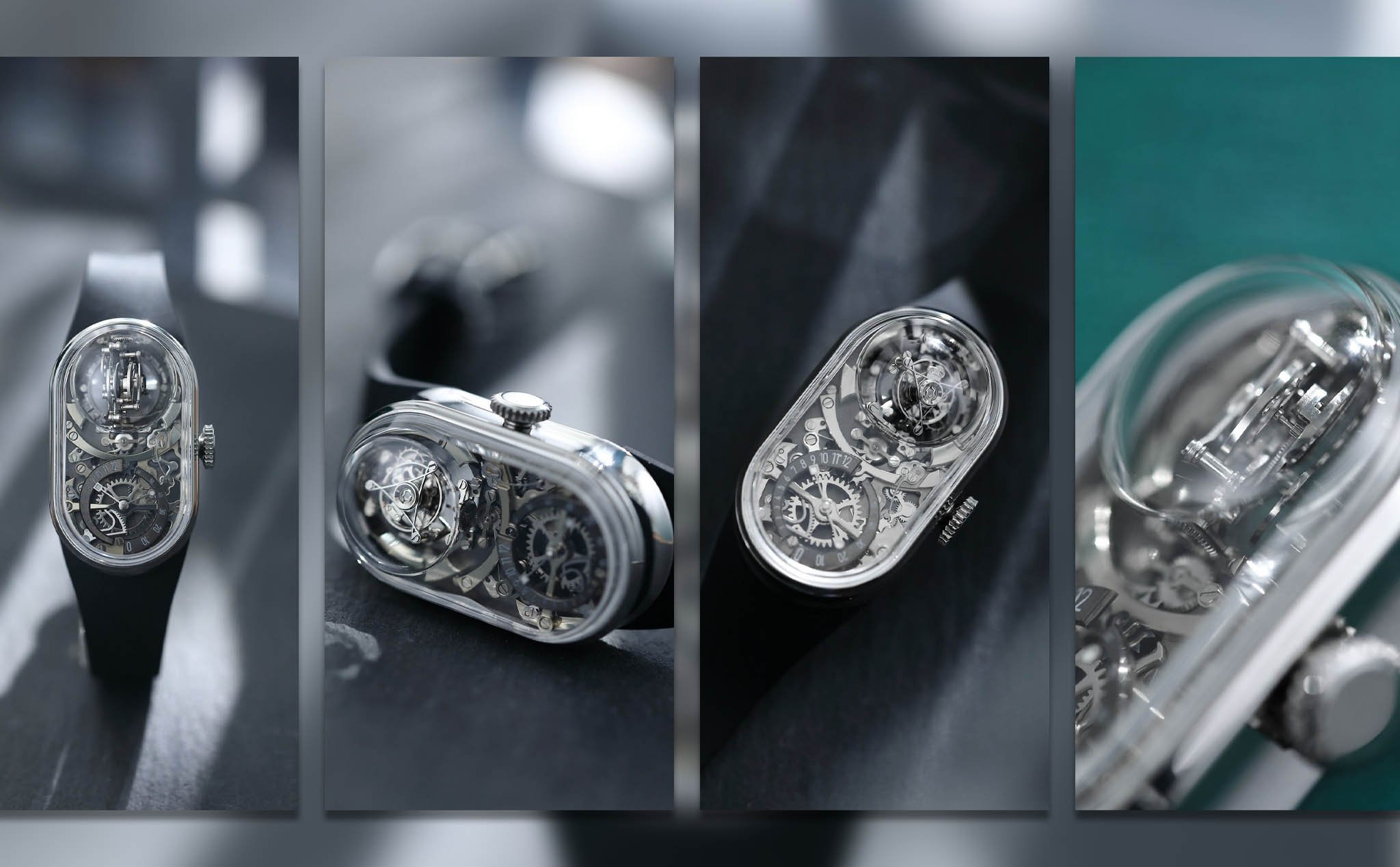 Những gì anh em nhìn thấy là bộ máy cơ lên cót tay M-01T. Trung tâm của cỗ máy thời gian mới này là lồng tourbilon 2 trục, đặt ở góc 12h, choán gần như một nửa toàn bộ không gian bên trong case thép không rỉ, kích thước 42.2mm x 24.3mm x 12.9mm. Hai trục của lồng tourbillon nơi đặt bộ thoát của máy cơ vận hành ở chu kỳ khác nhau. Một trục sẽ mất 60 giây để xoay xong 1 vòng. Trục còn lại chu kỳ xoay một vòng hết 150 giây, tức 2 phút rưỡi.