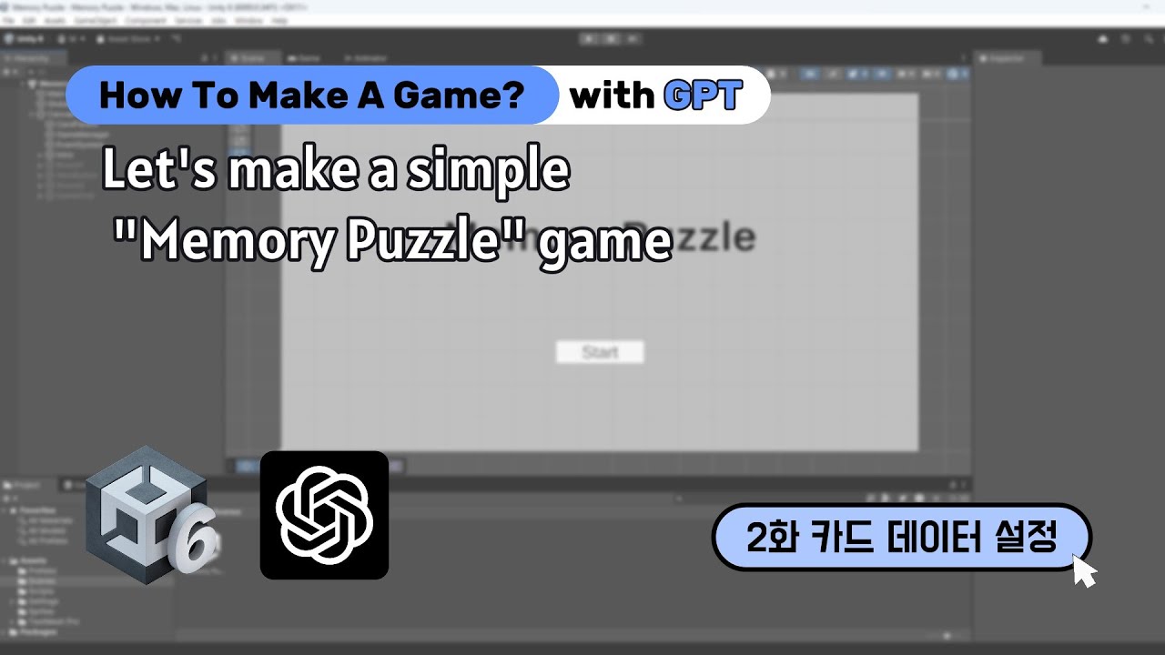 Unity와 Chat GPT를 활용해서 MCI(경도인지장애) 예방 게임을 제작해봅시다. 2화 카드 데이터 설정 목표1: Assets(카드 이미지)을 Unity에 추가하고 Prefab으로 만들 수 있다. 목표2: vsCode로 카드의 데이터를 저장하는 코드를 짤 수 있다. *프로젝트 전체를 보시려면 Github에서 프로젝트를 다운받으시면 됩니다. **동영상을 따라서 해보고 싶으시다면 구글드라이브에 있는 asset 폴더를 다운받아서 사용하시면 됩니다. [Github] https://github.com/parandurume/Memory-Puzzle.git [Assets] https://drive.google.com/file/d/16xAzes3x1lP3G9DjEwbs4Fgq_Gycfo0W/view?usp=sharing source